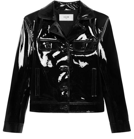 Celine's Straight blouson jacket in patent lambskin leather embodies timeless elegance. With a classic fit, it features two flap chest pockets and two welt pockets for practicality. Adorned with four Triomphe half-sphere buttons, including one on the cuff, this Italian-made masterpiece is perfect for those who appreciate refined style.