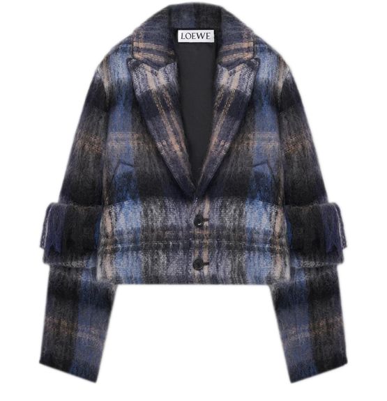 Introducing Loewe's jacket in mohair and wool blend, a chic addition to your wardrobe. This short, long-sleeved piece features a checked pattern and fringe details, offering a modern twist on classic style. Crafted from warm fabric, it boasts a 2-button closure and practical patch pockets, perfect for versatile styling.