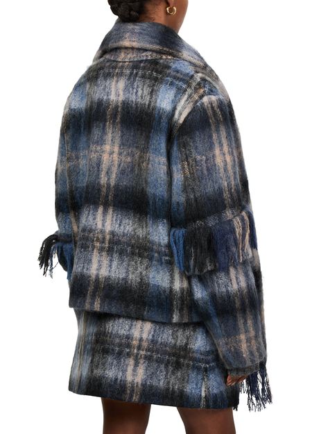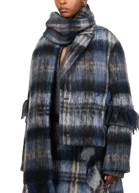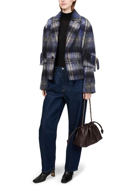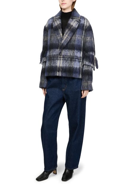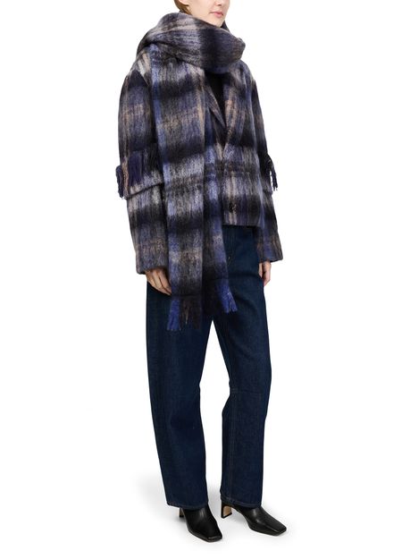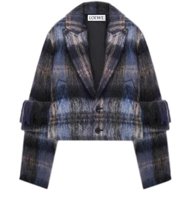 Introducing Loewe's jacket in mohair and wool blend, a chic addition to your wardrobe. This short, long-sleeved piece features a checked pattern and fringe details, offering a modern twist on classic style. Crafted from warm fabric, it boasts a 2-button closure and practical patch pockets, perfect for versatile styling.