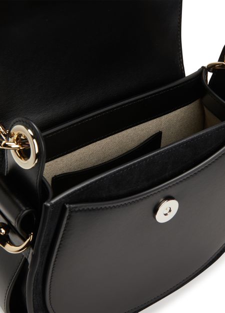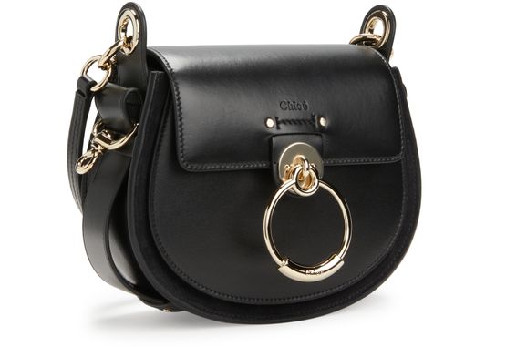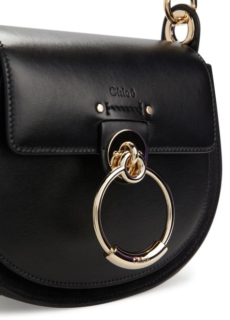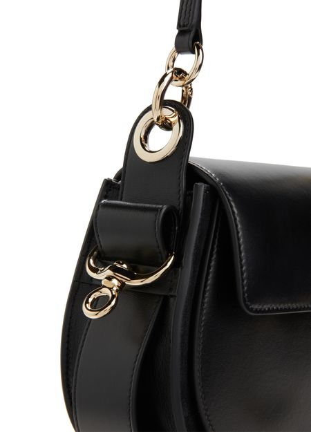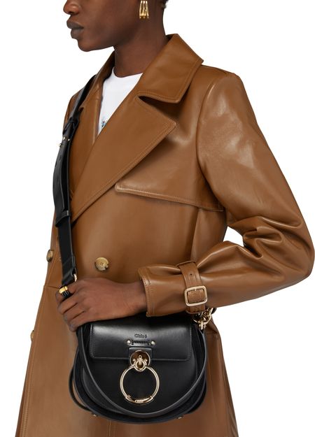 Chloé's Tess small bag is a versatile accessory suitable for all occasions. It features a wide shoulder strap and a handle, allowing it to be hand carried, worn on the shoulder, or crossbody. The bag has a flap closure with a magnetic closure for security. It also has interior patch pockets, a signature suspended ring, and an embossed logo for added style.