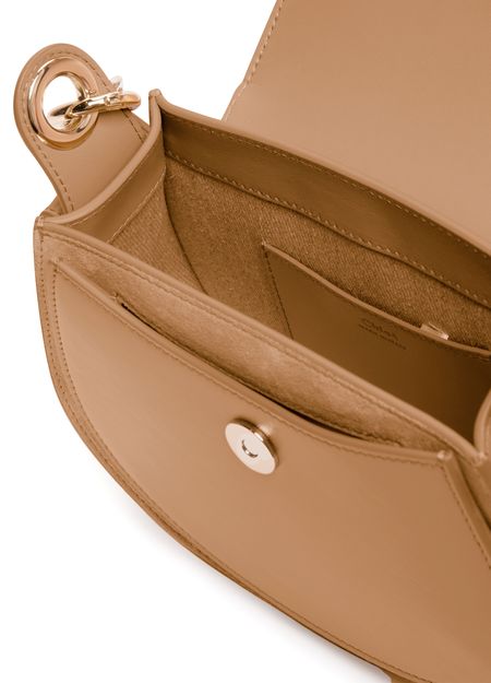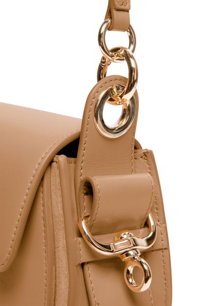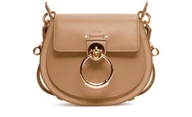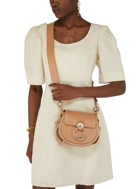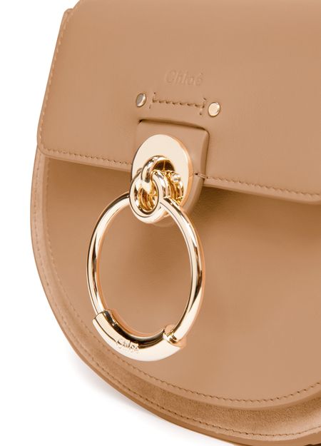 Chloé's Tess small bag is a versatile accessory suitable for all occasions. It features a wide shoulder strap and a handle, allowing it to be hand carried, worn on the shoulder, or crossbody. The bag has a flap closure with a magnetic closure for security. It also has interior patch pockets, a signature suspended ring, and an embossed logo for added style.