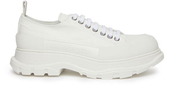 Step into edgy sophistication with Alexander McQueen's Lace-up Tread Slick Sneakers. The thick, notched sole provides both style and stability, while the logo on the side adds a subtle branding touch. Made from high-quality materials, these sneakers feature an embossed logo for a luxurious finish. Elevate your urban style effortlessly.
