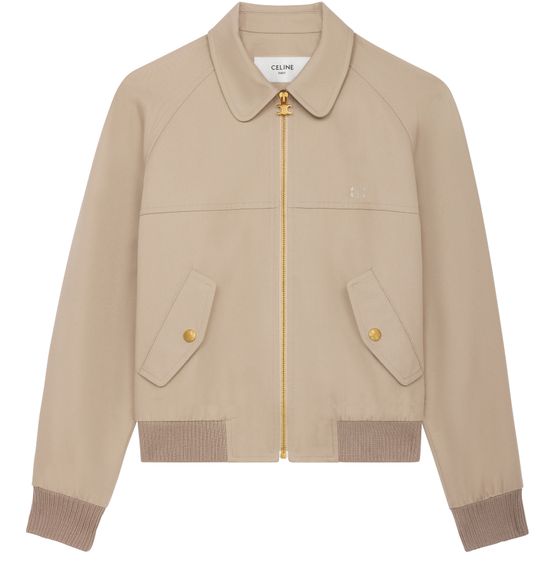 Unveil Celine's Triomphe blouson jacket in cotton gabardine, a blend of elegance and functionality. This classic fit features signature Triomphe embroidery, a shirt collar, and long raglan sleeves. With diagonal welt pockets and a zip closure adorned with a Triomphe tassel, it epitomizes modern sophistication.
