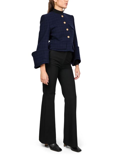 Discover Chloe's Tweed Jacket, an embodiment of casual elegance. With its boxy fit and crop length, this collarless design exudes modern charm. The button fastening and long sleeves enhance its practicality, while breast and flap pockets add style. The checked pattern completes its sophisticated appeal.