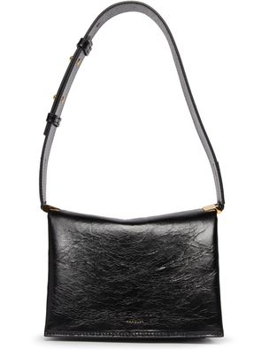 Wandler's Uma Box bag showcases a sleek design with a flap closure and an elegant front logo. Its adjustable strap allows for versatile styling, whether worn on the shoulder or crossbody. The gold finish adds a touch of sophistication, making it the perfect accessory for any occasion.