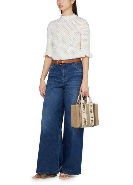 Chloé's Woody tote bag boasts a spacious single compartment, perfect for daily essentials. Its double handles allow for hand carrying, while a wide strap offers versatility. The printed logo adds a touch of elegance, complemented by visible topstitching and interior patch pockets for organized style. Effortless chic for every occasion.