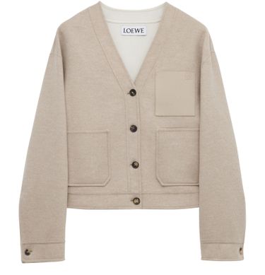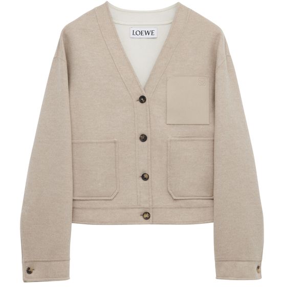 Reveal Loewe's ribbed wool cardigan, a refined piece featuring long sleeves and a button fastening for effortless sophistication. The soft wool texture and subtle ribbing create a sleek silhouette, while its versatile design transitions seamlessly from day to evening, making it a modern wardrobe essential.