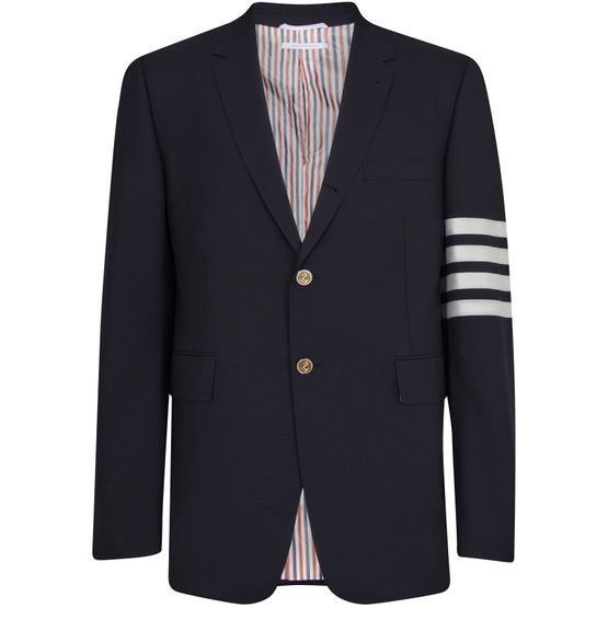 Thom Browne plays with the normal rules of urban fashion with this 4-Bar woollen blazer. It has a traditional cut, with two flap pockets on the sides and a raglan pocket on the chest. We love the four contrasting strips, worn like an armband on the left arm, and the unexpected buttonholes that create surprise by going up to the collar.