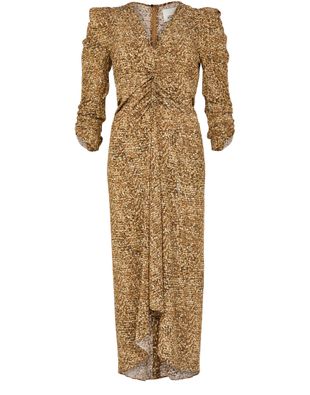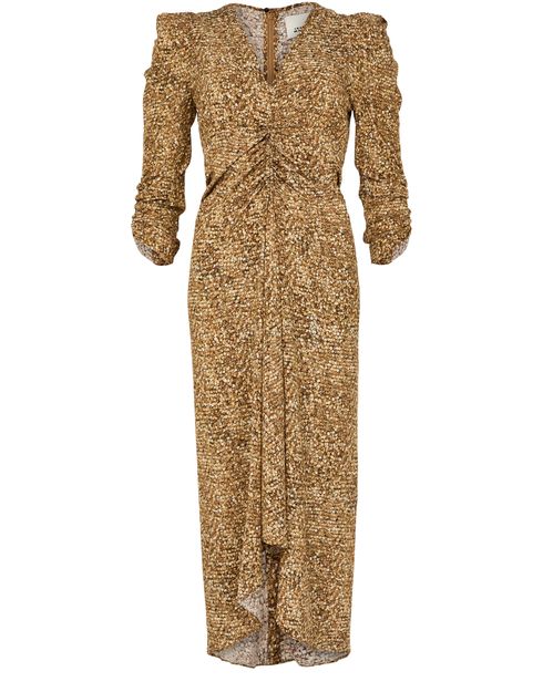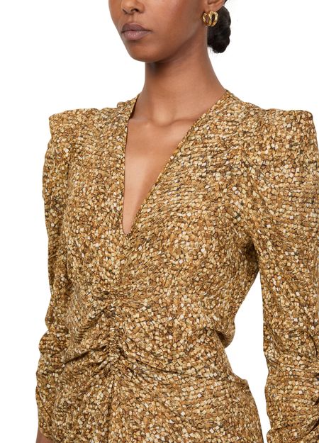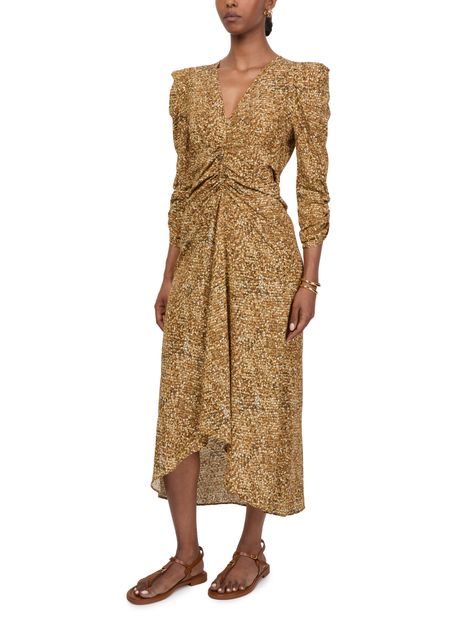 Reveal Isabel Marant's Albini midi dress, designed with a sleek slim fit. This V-neck, three-quarter-sleeved piece features a subtle front slit, enhancing its refined silhouette. Perfect for any occasion, the dress showcases the brand's attention to detail and modern elegance.