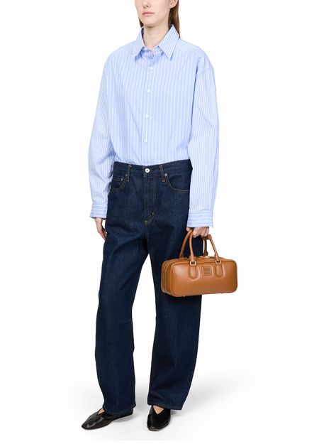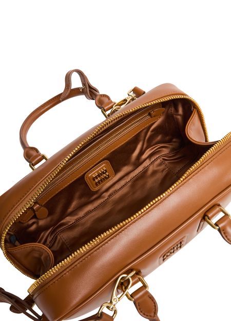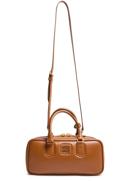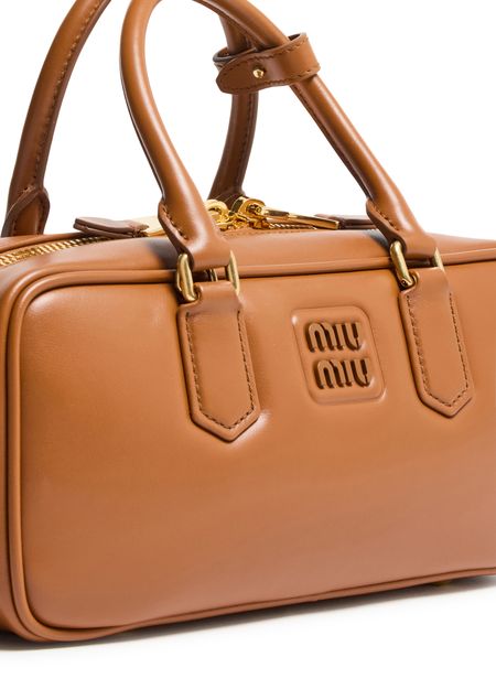 Reveal Miu Miu's Arcadie leather handbag, a masterpiece of modern design. Crafted from smooth leather, it features a metallic "Miu Miu" lettering and a versatile adjustable, detachable strap. The large interior compartment and zippered pocket ensure functionality meets elegance, all finished with a gold touch.