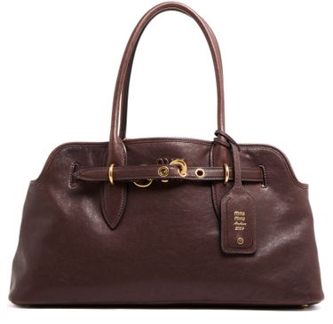 Miu Miu's Aventure nappa leather bag combines elegance and functionality. Its zipper closure secures belongings, while the gold finish and logo in gold letters add a touch of luxury. With double handles and a thin strap, it can be hand carried or worn on the shoulder, featuring a zippered interior pocket and visible topstitching for style and practicality.