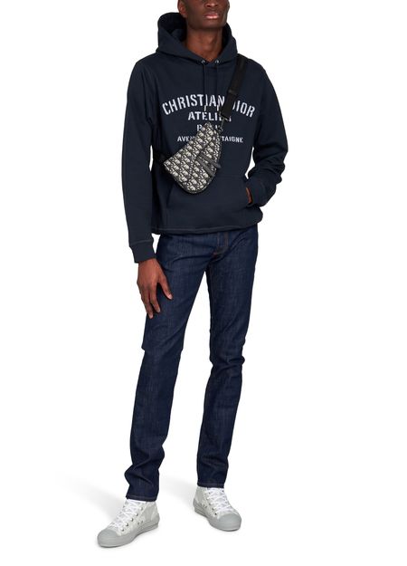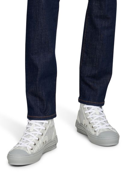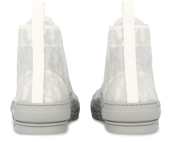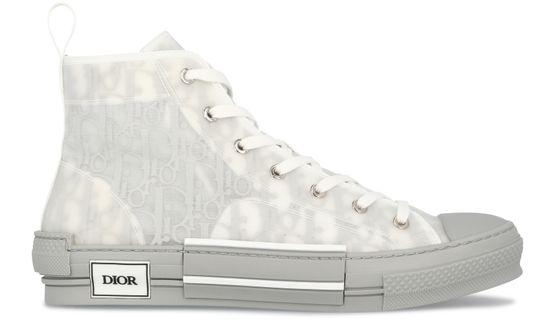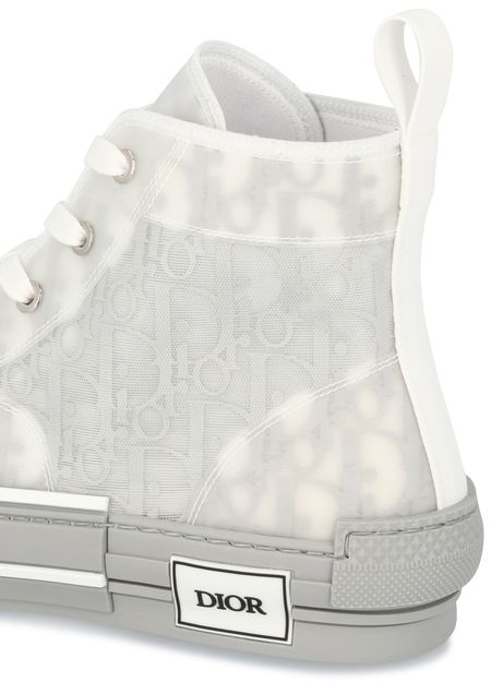The B23 high-top Dior Oblique sneakers are a stylish interpretation of a classic sneaker shape. Crafted in iconic blue Dior Oblique canvas, the high tops feature an innovative clear mesh casing which spotlights the printed interior. Navy blue lacing coordinates with a navy blue back loop. The sole, in navy blue rubber, features deconstructed and pieced detailing with a 'Dior' logo at the outer foot....