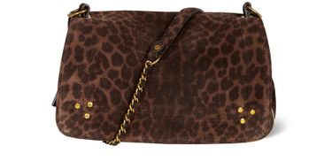 Reimagine Jerome Dreyfuss's Bobi bag, a chic accessory featuring a magnetic flap closure and a single compartment. With its gold finish, the detachable strap offers versatile crossbody wear. The standout leopard print and metallic logo on the front add a touch of elegance, complemented by visible topstitching and a decorative chain strap.