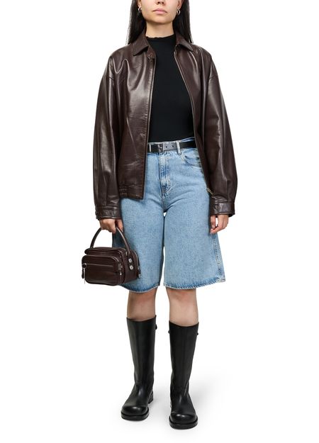 Reveal Acne Studios's Camero crossbody bag, a statement piece defined by its visible stitching and refined silver finish. The single handle and zippered front pocket offer both style and practicality, while the front logo adds a signature touch to this modern accessory.