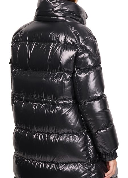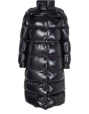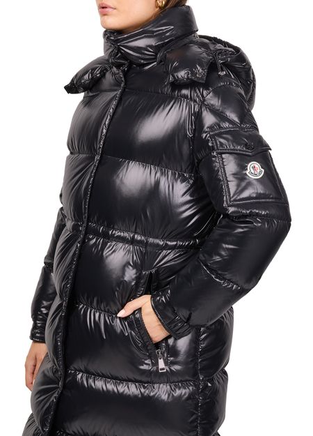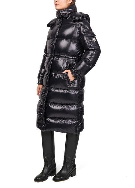 Celebrate Moncler's Cavettaz down jacket, crafted with a sleek long silhouette, hood, and button fastening. Its padded texture promises warmth while maintaining a modern edge.