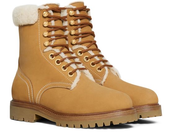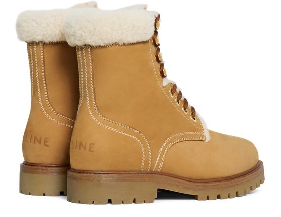 • Description : 50% calfskin 50% shearling, 100% shearling lining, 1.4 in (35 mm) heel, round toe shape, thick contrasting stitches, shearling padded collar on top of the shaft, celine signature debossed on the back of the shoe, celine signature engraved on hooks and eyelets, lace-up shoe, cotton laces.