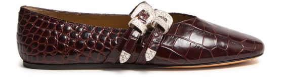 Reveal Le Monde Beryl's Claudia ballet flats, crafted in crocodile-embossed leather for a sophisticated touch. These ballet pumps feature a closed square toe and a flat heel, highlighted by a buckled strap and an engraved logo. The silver finish adds a polished flair to this chic design.