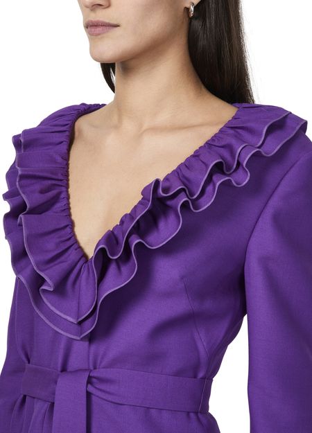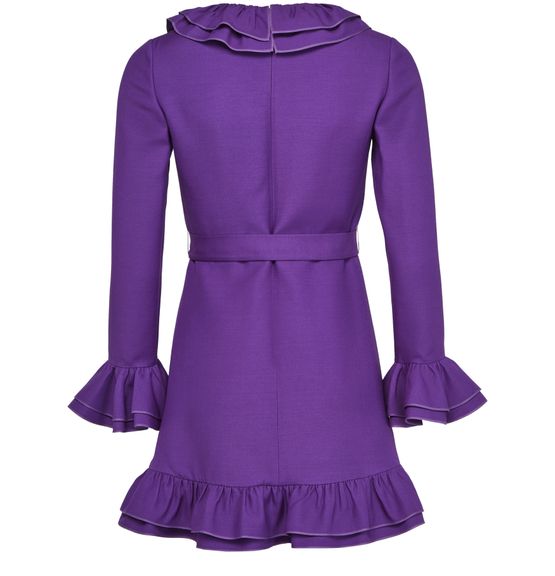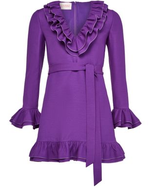 Valentino's Crepe couture mini dress showcases a v-neck and three-quarter sleeves, complemented by ruffle details and a belted waist. Its a-line cut flatters the silhouette, while the back zipper closure ensures a perfect fit. The detachable belt, crafted from the same fabric, accentuates the design, finished with visible stitching and an appliquéd logo.