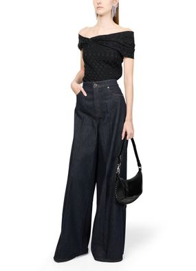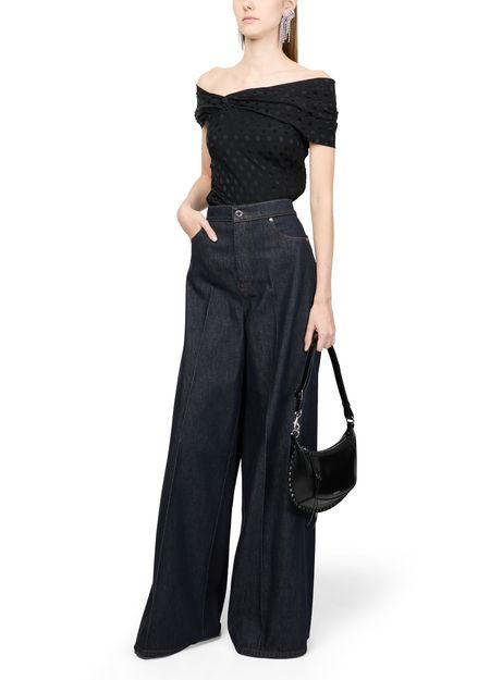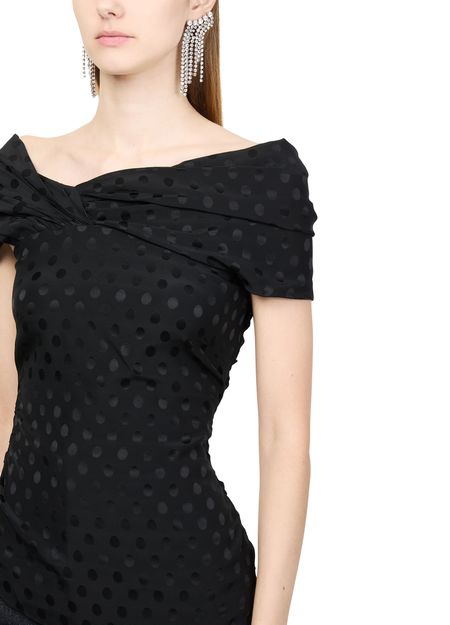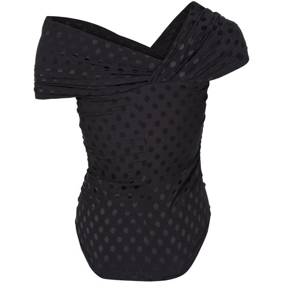 Reveal Isabel Marant's Esen short sleeve top, a slim fit masterpiece with a bare shoulder neckline and short sleeves. The polka dot pattern adds a playful touch, while the fitted waist accentuates your silhouette. Perfect for pairing with both casual and formal ensembles, this top is a versatile wardrobe essential.