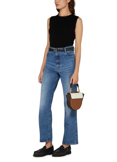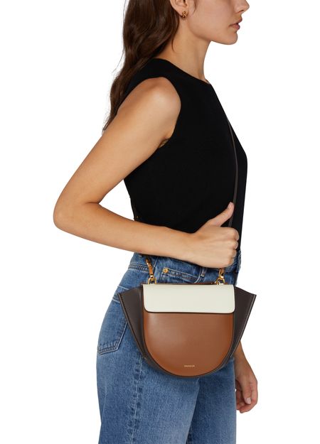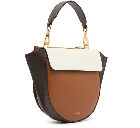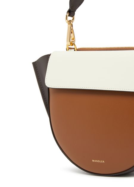 Wandler's Hortensia mini bag boasts a very soft to the touch feel, perfect for daily elegance. Its handle offers versatility, while visible stitching adds a touch of craftsmanship. The secure zipper closure keeps your essentials safe, and the logo in gold letters elevates its luxurious appeal, making it a must-have accessory.