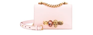 The mini Jewelled Satchel bag was designed by Alexander McQueen. The traditional compact form is highlighted by stunning jewels including a surprising skull.