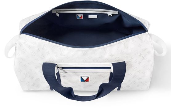 Part of the 37th America’s Cup collection, the Keepall Sport bag is made from Monogram Storm canvas, a water-resistant canvas with subtle Monogram embossing. The sporty colorway, aqua-zips for protection against moisture, and the LV fast-release buckle, all evoke the maritime world of the America’s Cup. A removable strap and top handles give carry options.