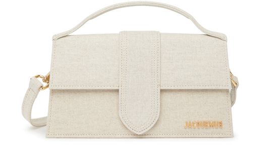 The Jacquemus large Bambino bag in linen is a versatile accessory that can be hand carried, worn on the shoulder or crossbody thanks to its detachable strap. The flap closure is secured with visible stitching and features the brand's logo in gold letters. The bag also has a handle for easy carrying.