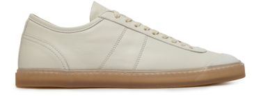 Lemaire's Linoleum laced up trainers showcase a sleek design with leather sneakers and lace-up shoes that offer both style and comfort. Visible stitching adds a touch of craftsmanship, while the thick outer sole ensures durability. The contrasting sole elevates the look, making these trainers a perfect blend of elegance and functionality.