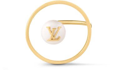 The ingenious design of the LV Eclipse Pearls ring evokes the beauty of the heavens. A lustrous white resin pearl marked with the LV Initials in gold-tone brass seems to float in the middle of a perfect golden circle, like a moon in orbit. This finely crafted jewel radiates a unique, timeless elegance.