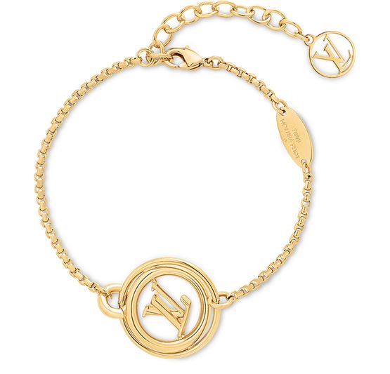 The LV Stellar bracelet demonstrates the innovative design that can be seen across the Spring-Summer 2023 fashion jewelry collection. The centerpiece is an LV Circle presented in a three-dimensional effect that creates a sense of movement. An adjustable chain complete with a small charm completes this polished metal piece.