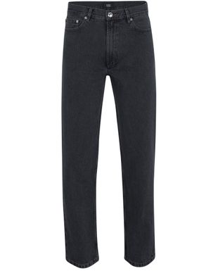 Description : Straight-cut jeans, front button, visible stitching, two front pockets, belt loops.