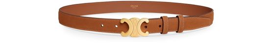Discover Celine's Medium Triomphe belt in nubuck calfskin, crafted for a middle-waist fit. Accentuated by a sleek gold finish, this belt wraps your waist with elegance. The Triomphe buckle with collar stud ensures a secure yet stylish closure, while the 1-inch width adds a subtle statement to any ensemble.