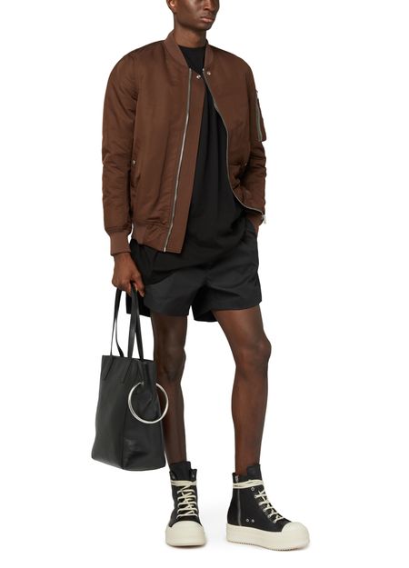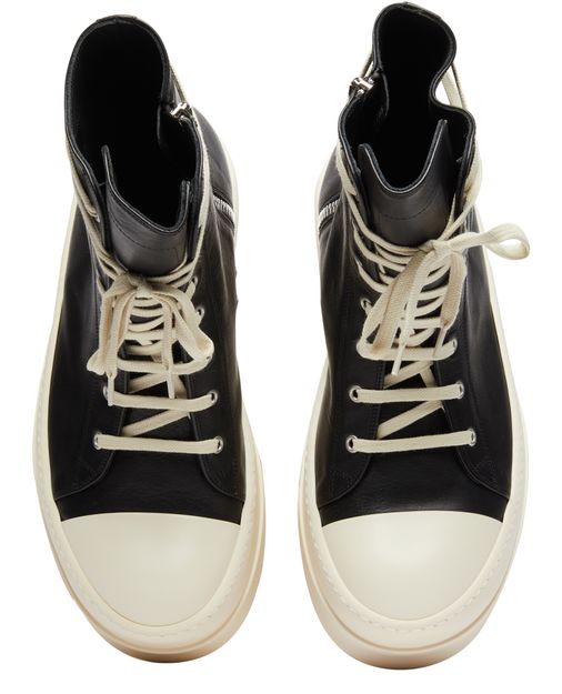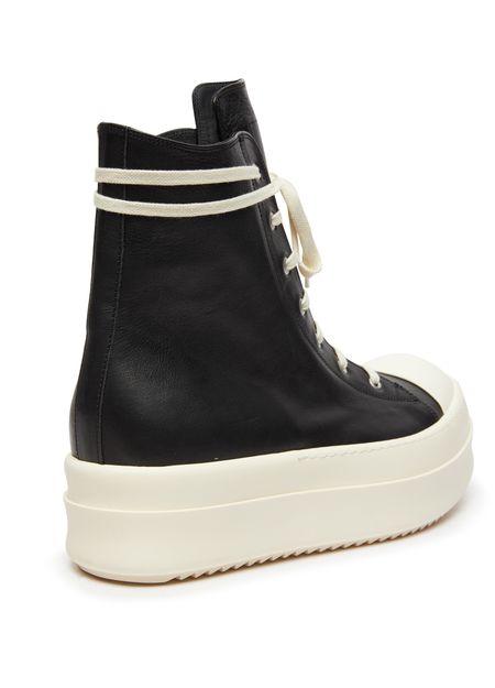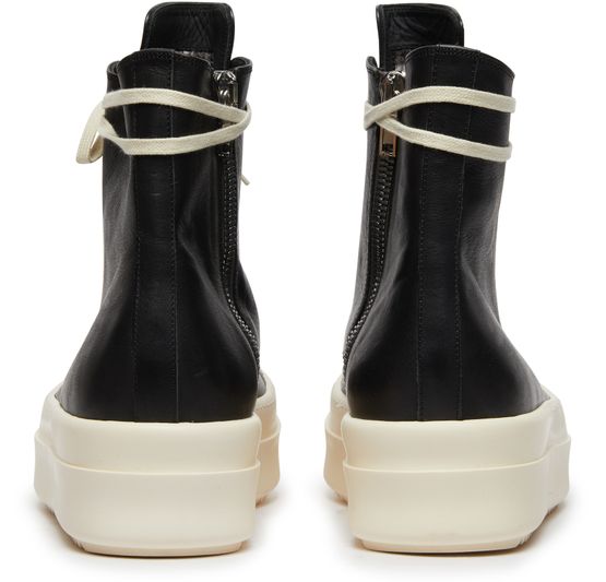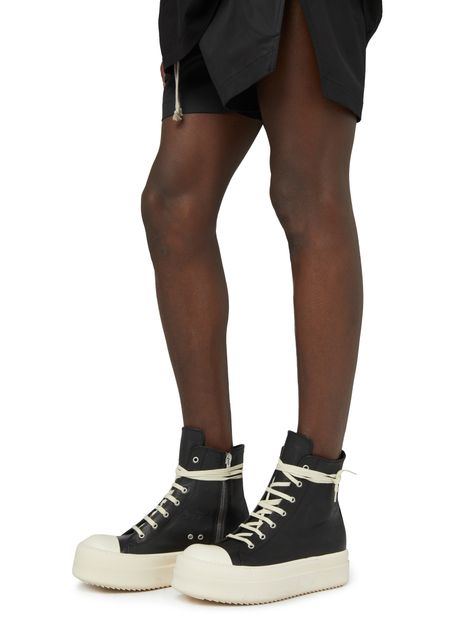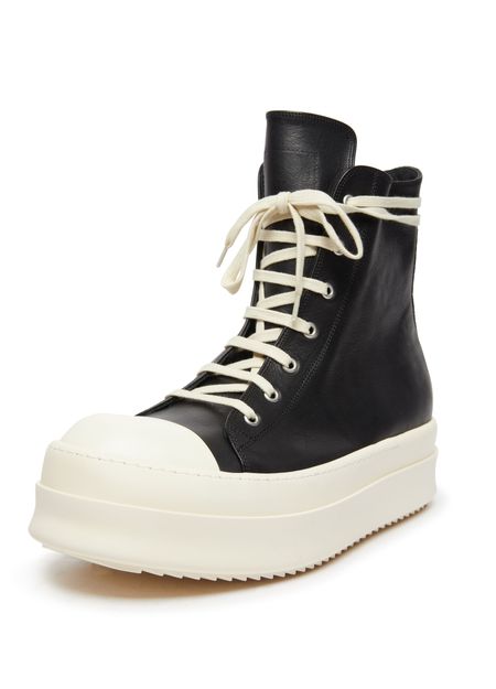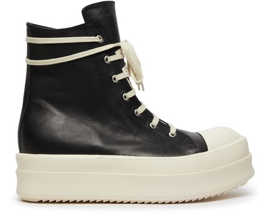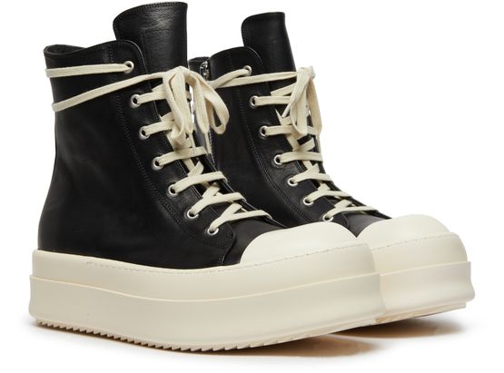 Rick Owens's Mega Bumper sneakers showcase a high-top upper with a round toe, offering a bold silhouette. The closed design features a side zipper for effortless wear, while the thick outer sole provides durability and support. Elevate your street style with these striking and avant-garde sneakers that command attention.