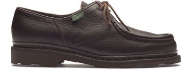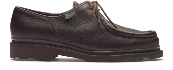 Introducing Paraboot's Michael derbies, these lace-up formal shoes are crafted from grained leather, offering a sophisticated touch with a block heel and thick outer sole. The round toe and logo-printed insole add to their elegant design, ensuring both style and comfort for any occasion.
