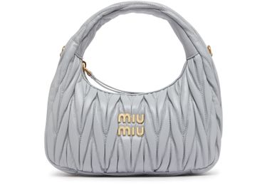 Miu Miu's Miu Wander hobo bag is crafted from chevron quilted leather with a metallic logo on the front. It features a gold logo in gold letters, a single handle for hand carrying or wearing crossbody, a zipper closure, and a padded texture with a gold finish.