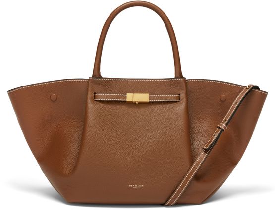 Reveal Demellier's The Midi New York handbag, crafted from grained leather with double handles and a thin, adjustable strap for versatile wear. The front logo, visible stitching, and silver finish add refined detail, while spacious compartments and secure snap-button fastening ensure both style and practicality.