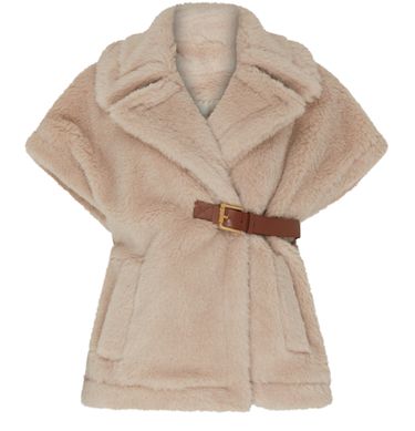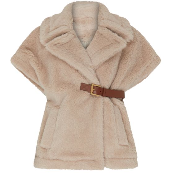 Max Mara's Newabavo cape showcases a regular length with a chic v-neck and short, bell sleeves. Its luxurious fur detail adds sophistication, while the appliquéd logo and logo at the back label subtly highlight the brand's elegance. Effortlessly stylish, this cape elevates any outfit for various occasions.