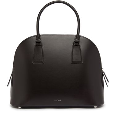 The Row handbag features a sleek design with thin straps and double handles for easy hand carrying. The silver finish and zipper closure add a luxurious touch, while the logo in silver letters on the front provides a subtle branding detail. This timeless and elegant handbag is a versatile and sophisticated accessory.