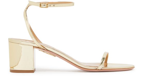 Aquazzura's Olie sandals combine elegance and comfort with their open round toe and medium block heel. Featuring visible stitching and an appliquéd logo, these sandals secure with a buckled ankle strap. The contrasting sole adds a stylish touch, while the silver finish elevates any outfit, making them perfect for chic occasions.