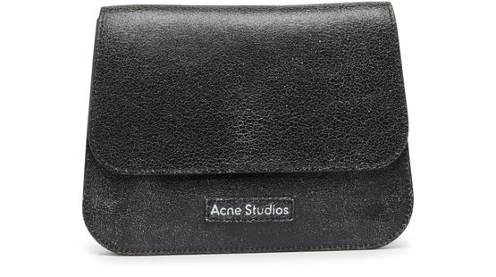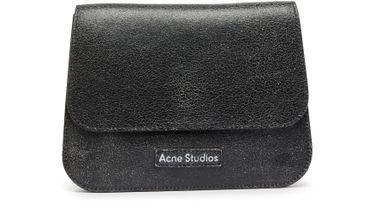 Acne's Platt long strap bag features an appliquéd logo on the front and a printed logo on the flap closure. The back of the bag showcases a logo in silver letters. It can be worn crossbody with its thin strap and silver finish hardware. The snap-button fastening and single handle add convenience to its stylish design.