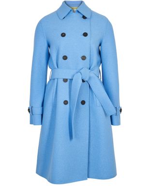 This piece's elegant cut and sophisticated texture demonstrate Harris Wharf's craftsmanship. This pressed wool trench is a women's creation with a delicate shape, adjusted with a belt.