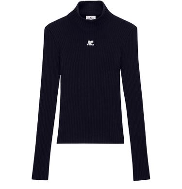 Reveal Courreges's long ribbed knit top, featuring a sleek mockneck and long sleeves for a refined silhouette. The embroidered chest logo adds a signature touch, while the textured finish ensures modern appeal. Effortlessly versatile, this piece transitions from day to night with ease.