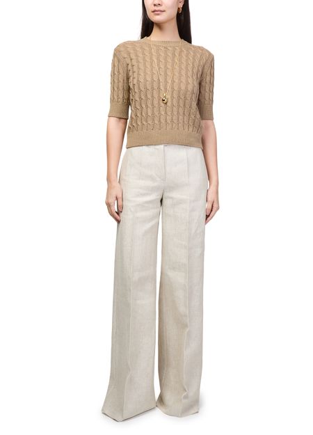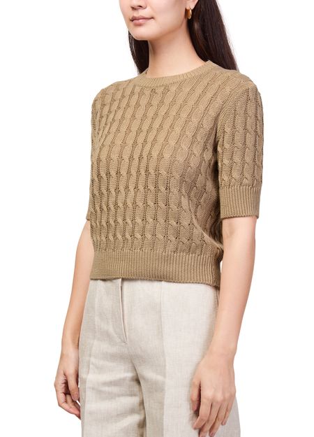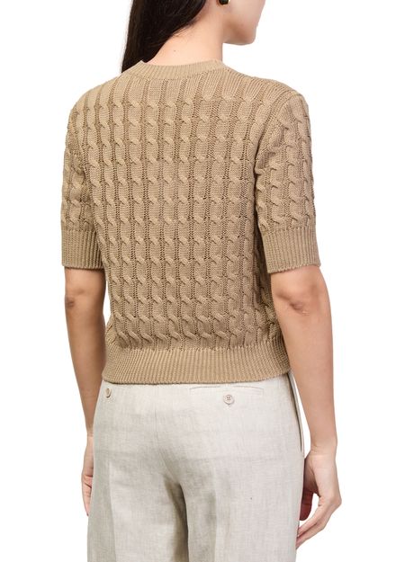 Reveal Max Mara's round neck knitted t-shirt, crafted with a refined crew neckline and short sleeves for a sleek silhouette. The soft knit texture offers comfort and versatility, making this top an effortless choice for layering or standalone wear, seamlessly elevating both casual and polished looks.