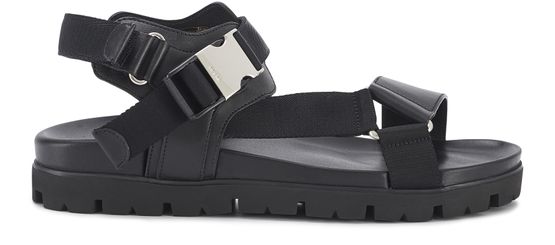 These sandals are by Prada. These flat shoes have a sleek monochrome design. Wide straps are fastened with a clip.