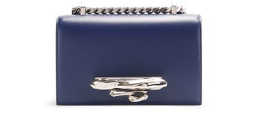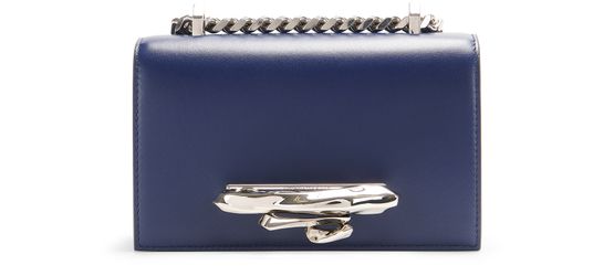 Decorated with a signature clasp in the shape of brass knuckles, this mini Satchel bag by Alexander McQueen features a flap closure and a chain shoulder strap.