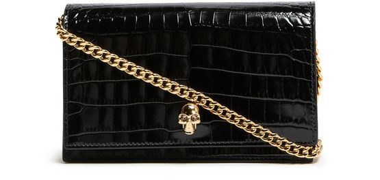 Unveil the Alexander McQueen Skull small crossbody bag, an epitome of elegance crafted from crocodile-embossed leather. With its gold finish and front logo, this mini bag offers a chic chain strap and functional design featuring a flap closure, single compartment, and interior card slots.
