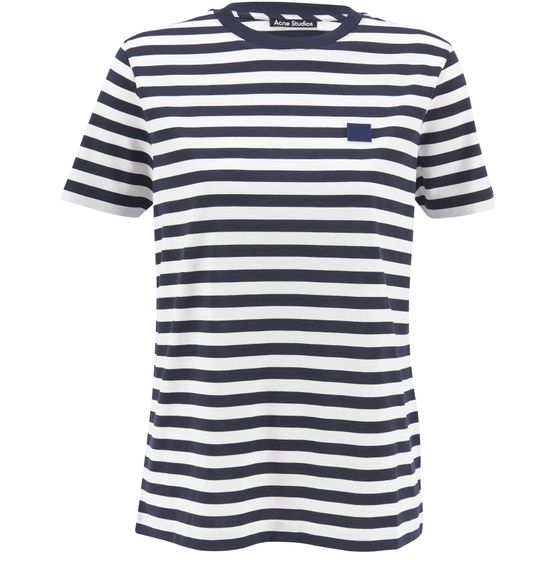 Covered with narrow horizontal stripes, this elegant slim-fit T-shirt has streetwear accents. Its modern design was created by Acne Studios.