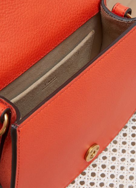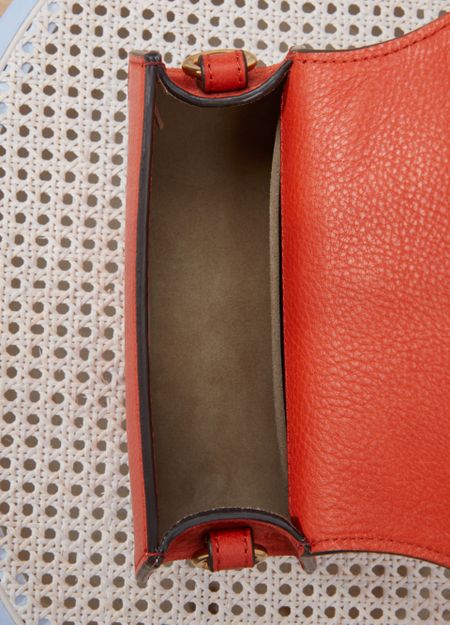 • Description : Mini bag, slender, adjustable, detachable strap, interior pocket, calfskin leather, metal with an aged gold finish, flap closure, press stud fastener, worn in the hand, on the shoulder or crossbody.