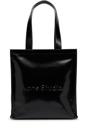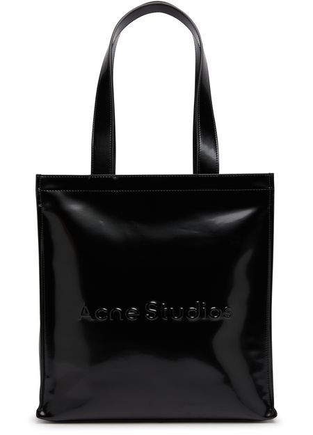 Acne's Tote bag features a sleek design with a front embossed logo and a thin strap for easy carrying. The interior patch pockets provide organization, while the single compartment offers spacious storage. The snap-button fastening ensures security, and the double handles allow the bag to be worn on the shoulder for versatile styling.