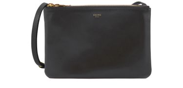 The Small Trio bag in smooth lambskin is an elegant crossbody bag with a zipped closure. The bag has three zipped pouches attached together with snap buttons. The leather strap is adjustable.